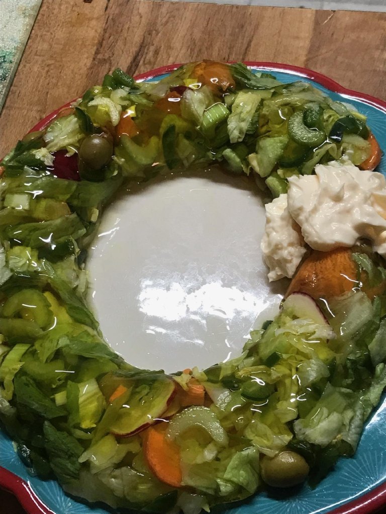 Of course, this is the lemon jello salad. The red jello had sliced bananas, or it could have fruit cocktail; the green jello was with pears or maybe cottage cheese; the orange jello had shredded carrots or mandarin oranges. The best one was unflavored gelitin with bloody Mary mix, olives, and dill pickle relish.