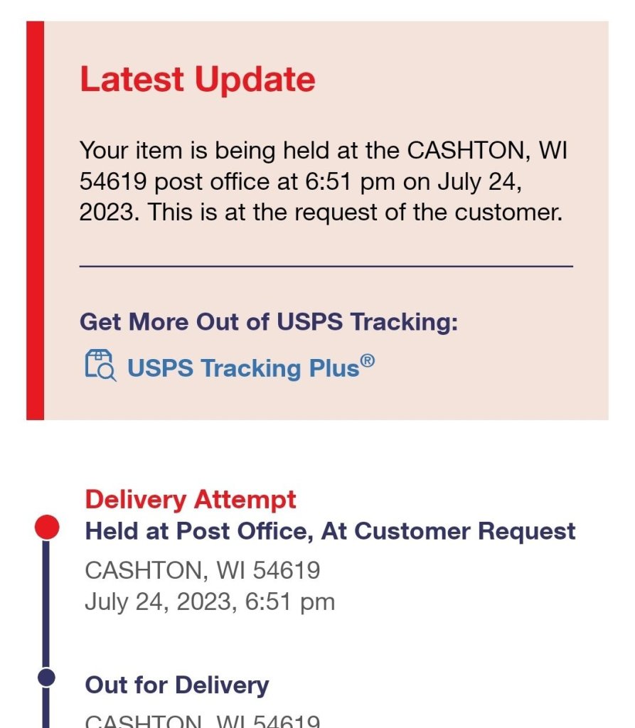 Friday I was waiting for a package. Saturday it said in tracking it was in town it did not come. Sunday, I cked tracking the PO HAD SENT IT TO ANOTHER TOWN…go figure. Monday, it arrived in mailbox. I was surprised there weren’t two packages as the one that was scheduled to arrive Monday said it was out for delivery. This Morning the out for delivery package says…