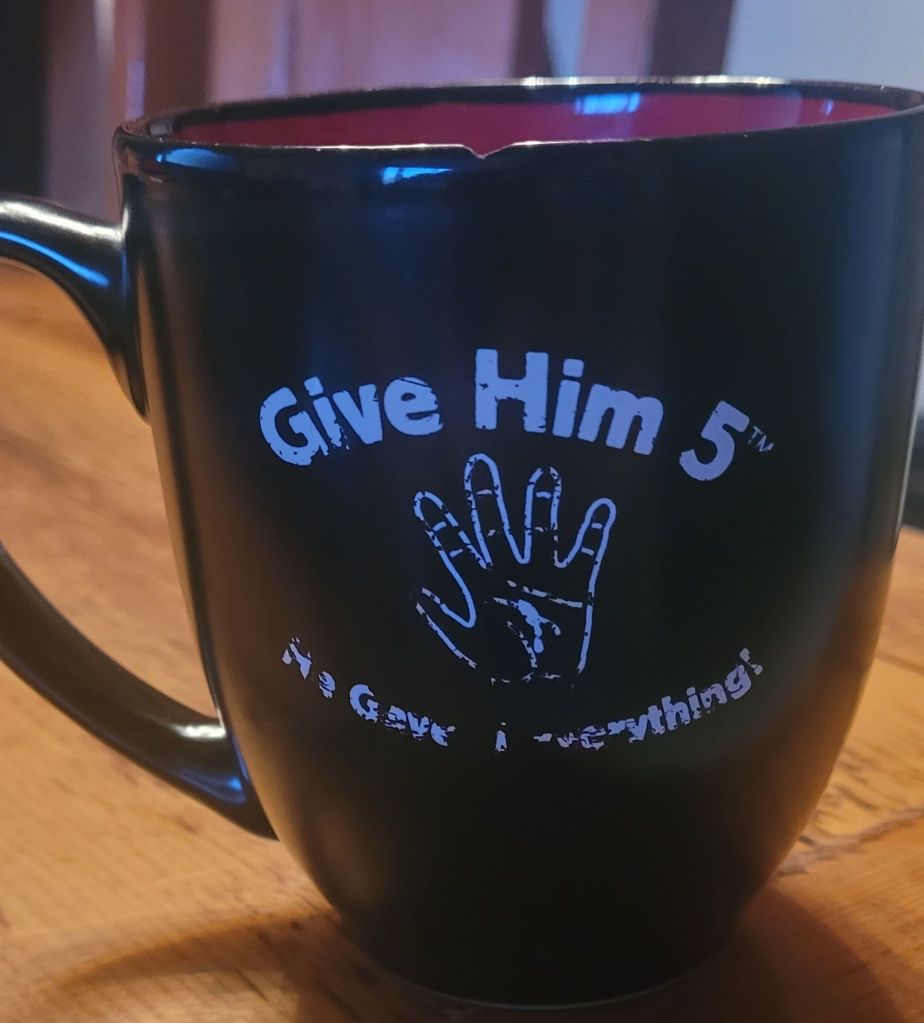 I pulled my Give him 5 cup from the cabinet this morning. Back in ’12/’13 I had purchased it from ‘give him 5’ along with a little muslin bag with prayer helpers in it. I learned this morning she had passed away. May she rest in peace.