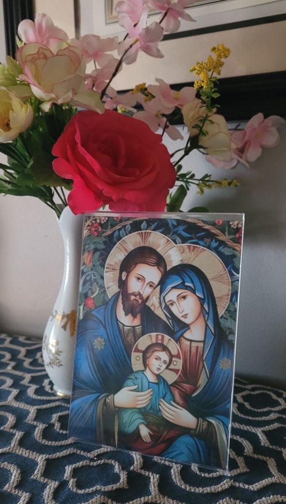 New month- The Church’s theme for this month is, “The Holy Family”. Above is a photo of my home altar for this month. I’d like to encourage each of you to have a home altar and if possible make it the focus point of your prayer time. Ours is located in the dining room of our home and honestly may be a little over the top but it inspires me to be more aware of Jesus, which is the purpose for it. Take a few moments to run through your memory verses and see how they are coming for you. I can tell you from experience if you don’t commit them to memory they won’t be there when you need them.