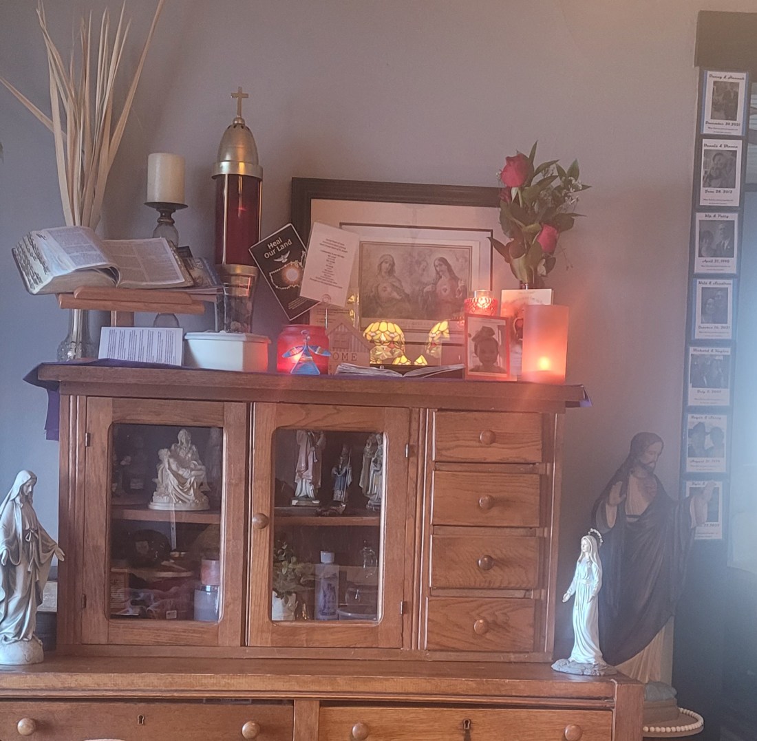 Roses from DD#5 sit on top the home altar that’s cluttered with candles, lists, photos, statues, and scripture. My winter quiet spot that does not see enough of my time or attention.